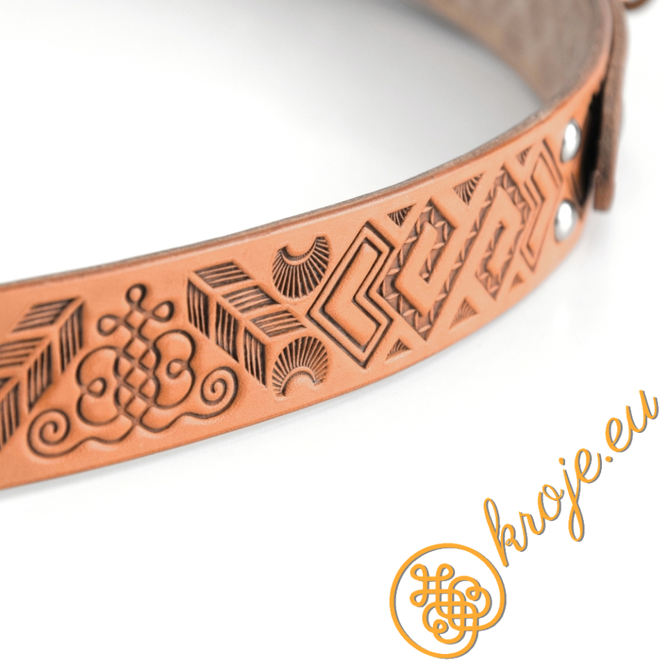 Folklórny kožený opasok s mosadznou prackou, zdobený hlbokým razením - výška opaska 3 centimetre